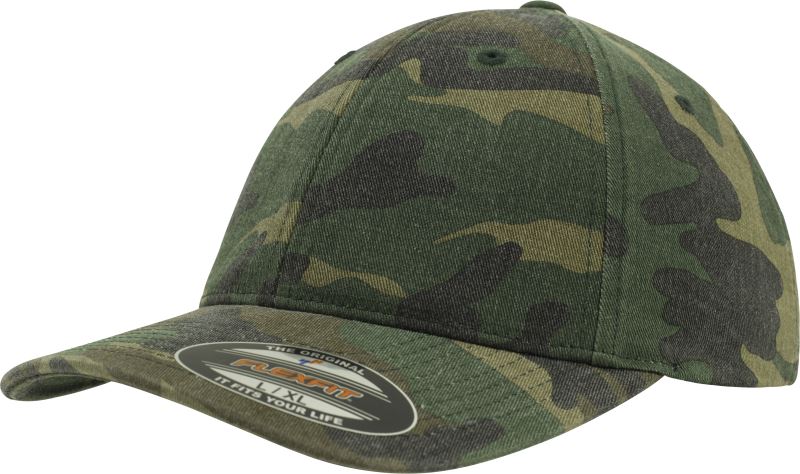 Aufkleber auf dem Schirm, leicht gebogener Schirm, Schirmunterseite Ton-in-Ton, 8 Ziernähte am Schild, Camouflage Muster, 6 gestickte Luftlöcher, Flexfit® Technologie ohne Verschluss, nicht waschen, nicht bügeln, nicht trocknergeeignet, nicht chemisch reinigen