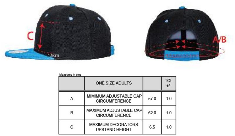 Flaches Schild mit 6 Ziernähten, Knopf und Schild in Kontrastfarbe, Frontpanele verstärkt, Luftlöcher, Kunststoffverschluss, Tear Away Label, Handwäsche, nicht bügeln, nicht trocknergeeignet, nicht chemisch reinigen