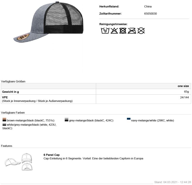 8 Ziernähte am Schild, gefüttertes Schweißband, Frontpanele laminiert, 2 gestickte Luftlöcher an den vorderen Panels, Größenregulierung durch „click&snap“ Verschluss, Melange-Optik, 40° waschbar, Handwäsche, nicht bügeln, nicht trocknergeeignet
