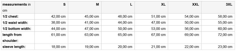 | Farbe | black, white, acid yellow, aqua, ash, aubergine, brown, dark green, dark grey, dark orange, dark royal, fern green, gold yellow, graphite, grey heather, irish green, khaki, light blue, light grey, light yellow, lilac, lime green, mint, navy, olive, orange, pacific, petrol, pink, purple, red, rose, royal, sky blue, stone, tomato, turquoise, wine, yellow |