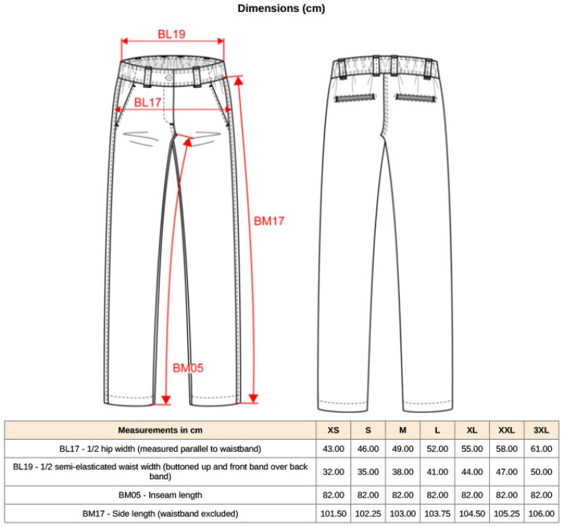 Elastischer Bund mit Gürtelschlaufen, Reißverschluss und Knopf, 2 schräge Seitentaschen inklusive 1 Tickettasche, 2 Gesäßtaschen mit Paspel und verstärkten Nähten, mit Schlaufe zum Aufhängen, widerstandsfähig, 60° waschbar, trocknergeeignet bei niedriger Temperatur, nicht chemisch reinigen
