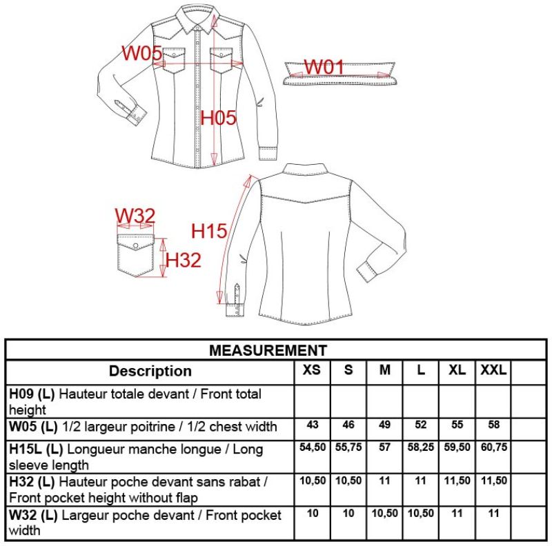 Taillierter Schnitt, Schulterpassen vorne und hinten, Manschetten mit Druckknöpfen, abgerundeter Saum, Druckknöpfe, 2 Brusttaschen mit Druckknöpfen und Verschlussklappen, 30° waschbar, nicht trocknergeeignet
