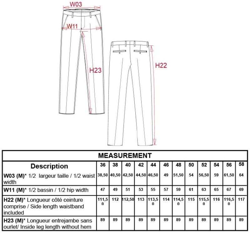 Bund mit Gürtelschlaufen, an Beinen schmal geschnitten, gesäumte nicht umgenähte Hosenbeine zum individuellen Anpassen der Länge, Reißverschluss mit verdecktem Haken und Knopf, 2 schräge Taschen vorne und 2 Gesäßtaschen mit Paspel, halb gefütterte Front, französische Größen: bitte Umrechnung entsprechend Maßtabelle, 40° waschbar, chemische Reinigung, nicht trocknergeeignet