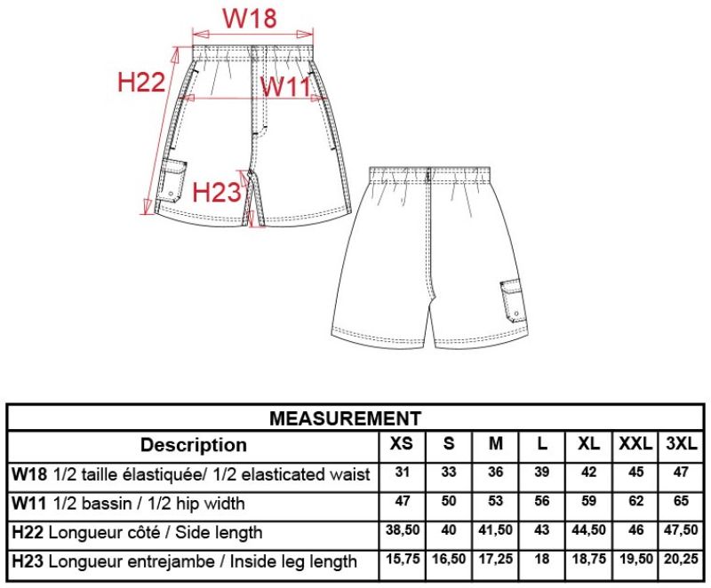 Elastischer Bund mit innenliegender Ziehkordel, Innenhose: Netzgewebe, 1 aufgesetzte Seitentasche, 2 Seitentaschen, Nähte in Kontrastfarbe, Tear Away Label, 40° waschbar, nicht trocknergeeignet, nicht chemisch reinigen