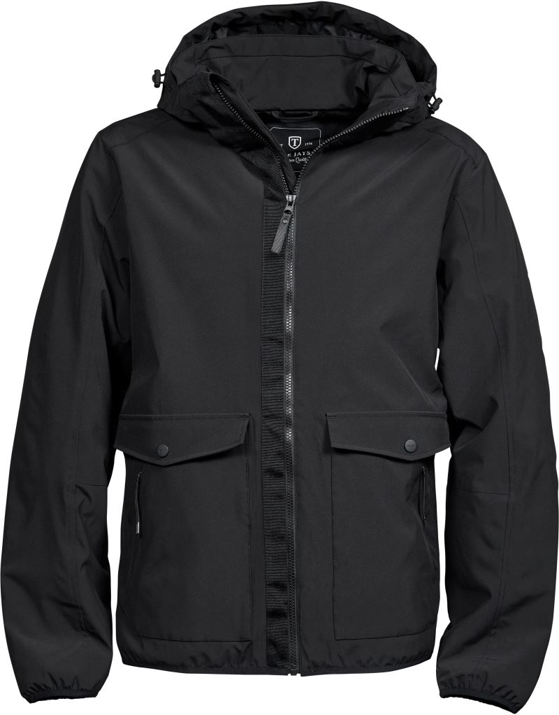 Laufende Materialumstellung auf recyceltes Polyester in Gange, 2-lagiges Funktionsmaterial, wasserabweisend (8.000mm Wassersäule), atmungsaktiv (3.000g/m² in 24h), abnehmbare Kapuze mit Kordelzug, elastischer Saum und Ärmelabschluss, Kinnschutz, SBS Reißverschluss, 2 Seitentaschen mit Reißverschluss und Klappe mit schwarzem Metalldruckknopf, Innentasche mit Druckknopf, Veredelungszugang am Rücken, BIONIC-FINISH®