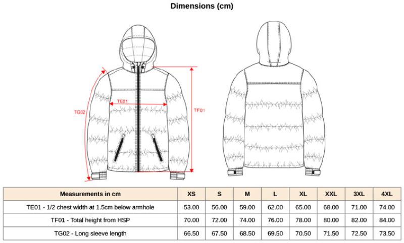 100% Polyamid, 210T, Schultereinsätze: 100% Polyamid Taslon, 500D, Futter: 100% Polyester Taft, Wattierung: 100% Polyester, Kapuze: 100% Polyamid Taslon, 500D