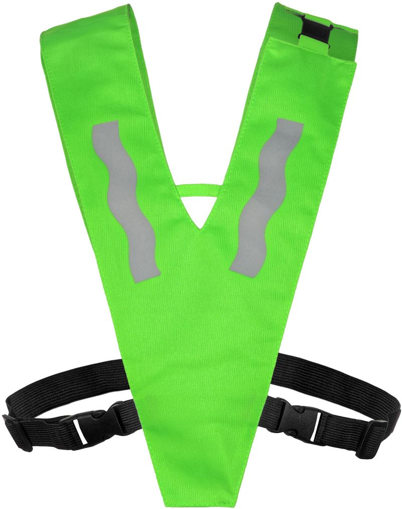 Größenregulierung durch Klettverschlüsse an den Seiten, zertifiziert nach EN 13356, zwei 5cm breite Reflexstreifen um den Körper