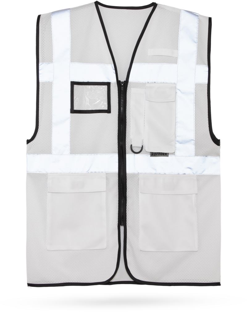 Durchgehender Reißverschluss vorne, 2 Taschen vorne, Ausweistasche, Handytasche, D-Ring, zertifiziert nach EN ISO 20471, je 1 Reflexstreifen über jeder Schulter, zwei 5cm breite Reflexstreifen um den Körper