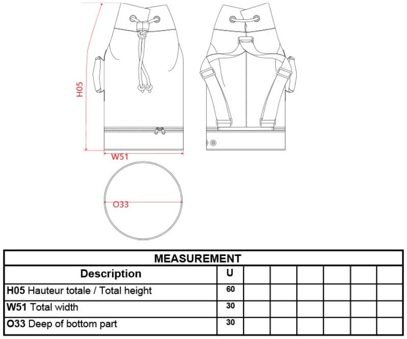 Kordelzug, seitlicher Tragegriff gepolstert, verstellbarer Schultergurt, wasserdichter Reißverschluss, Metallösen, Maße: 62x32cm Durchmesser, Fassungsvermögen: 64l, nicht trocknergeeignet