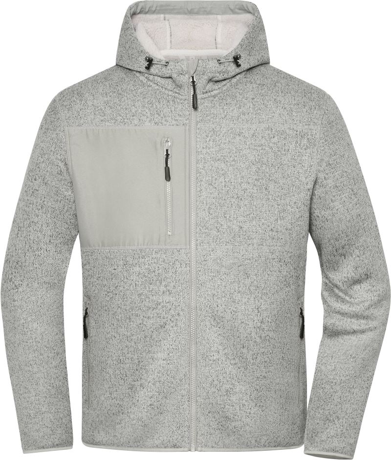 Außenseite in Strickoptik, Innenseite aus Sherpa, 2-lagige Kapuze mit Kordelzug, verstellbare Kapuze, unterlegter Reißverschluss mit Kinnschutz, YKK Reißverschlüsse, 2 große Innentaschen, 2 Seitentaschen und 1 Brusttasche mit Reißverschluss, Melange-Optik, 30° waschbar, nicht trocknergeeignet