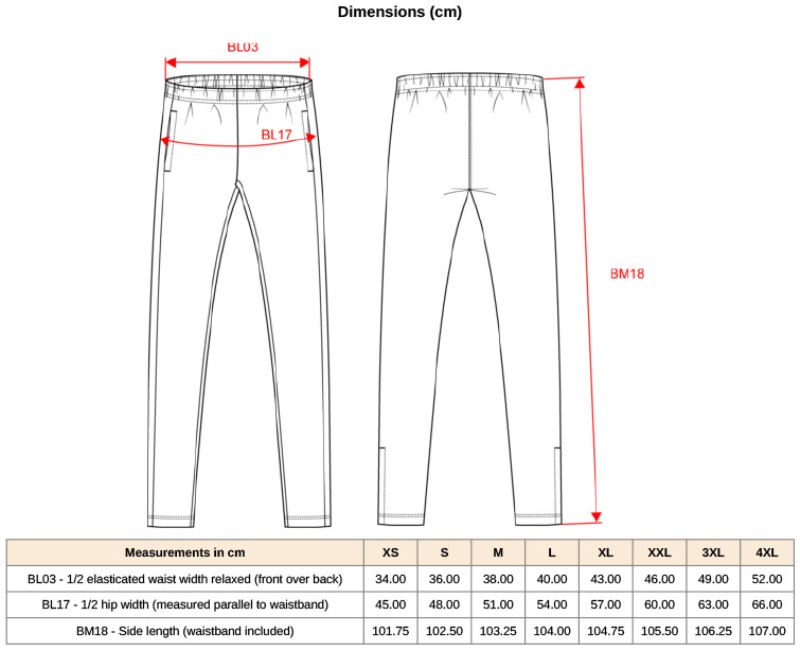 Schmaler Schnitt, Beinabschluss mit Reißverschluss, elastischer Bund mit Kordelzug, 2 Seitentaschen mit Reißverschluss, Doppelnähte am Saum, matte Oberfläche, Tear Away Label, 40° waschbar, nicht bügeln, nicht trocknergeeignet, nicht chemisch reinigen