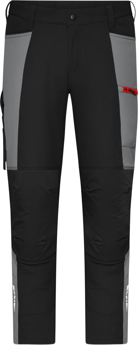 Wasser- und schmutzabweisend, elastischer Bund mit Gürtelschlaufen, ergonomisch eingearbeitetes Kniepolster, Tasche mit Reißverschluss am linken Bein, YKK Reißverschluss, 2 Gesäßtaschen, diverse Schub- und Werkzeugtaschen, reißfeste 3-fach Naht, strapazierfähiger, elastischer 4-Wege Stretch mit hohem Elasthananteil für optimale Passform, Zollstocktasche, Stiftefächer sowie Kniepolster und Saumbereich aus robustem, elastischem Polyamid-Gewebe, reflektierender Druck (ohne Schutzfunktion), 40° waschbar, nicht trocknergeeignet, Größen (62-64) Art.Nr. 02.184X