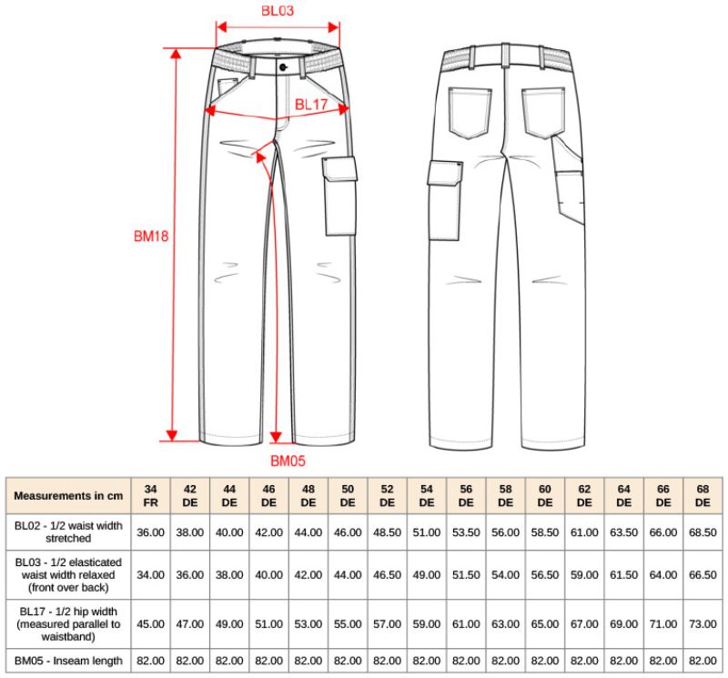 Elastischer Bund mit Gürtelschlaufen, 2 Taschen vorne und 1 Tickettasche, 2 Gesäßtaschen, aufgesetzte Tasche mit Patte und Klettverschluss links, doppelte Werkzeugtasche auf der rechten Rückseite, doppelte Seitennähte, 3-fach Nähte im Schritt und an der Gabel, Tear Away Label, 40° waschbar, trocknergeeignet bei niedriger Temperatur, Größen (52-62) Art.Nr. 20.709X