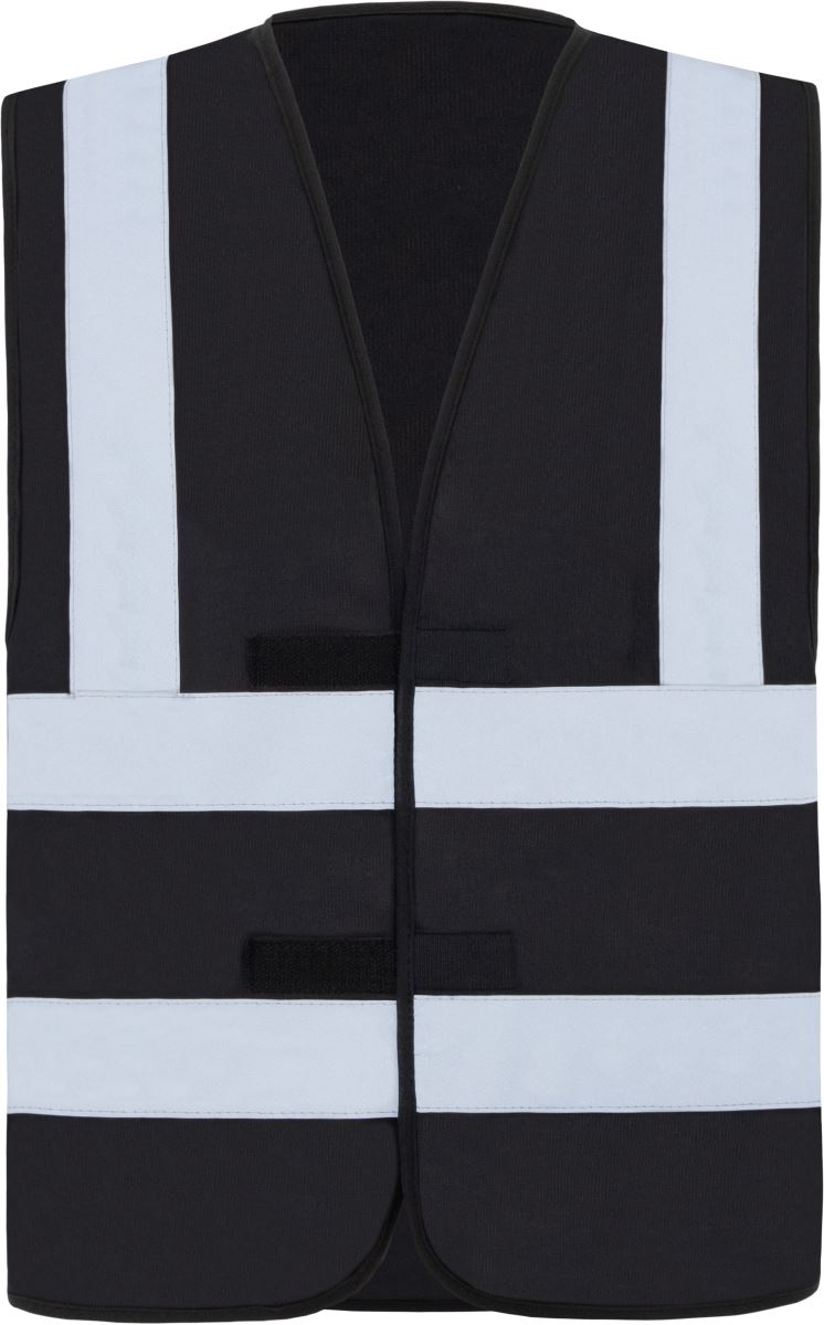 Größenverstellung durch 2 Klettverschlüsse, gelb und orange entsprechen EN ISO 20471, alle anderen Farben EN 17353 Typ B3 (Dunkelheit), vier 5cm breite Reflexstreifen