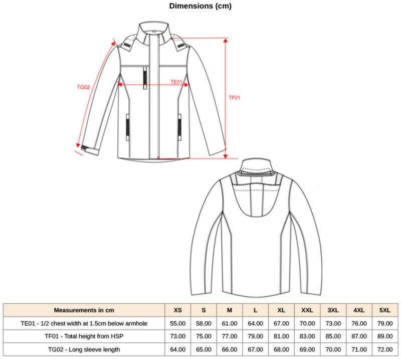 Wasserdicht (10.000mm Wassersäule), atmungsaktiv (3.000g/m² in 24h), abzippbare 3-lagige Kapuze im Kragen, verstellbare Ärmelbündchen mit Klettverschluss, verstellbarer Saum mit Kordelzug, 1 Innentasche mit Klettverschluss, 2 Seitentaschen und 1 Brusttasche mit Reißverschluss, Paspel in Kontrastfarbe, Veredelungszugang am Rücken und an linker Seite, Schlaufe zum Aufhängen, entsprechend Norm EN343:2019 Klasse 3, Tear Away Label, 40° waschbar, nicht trocknergeeignet, nicht chemisch reinigen